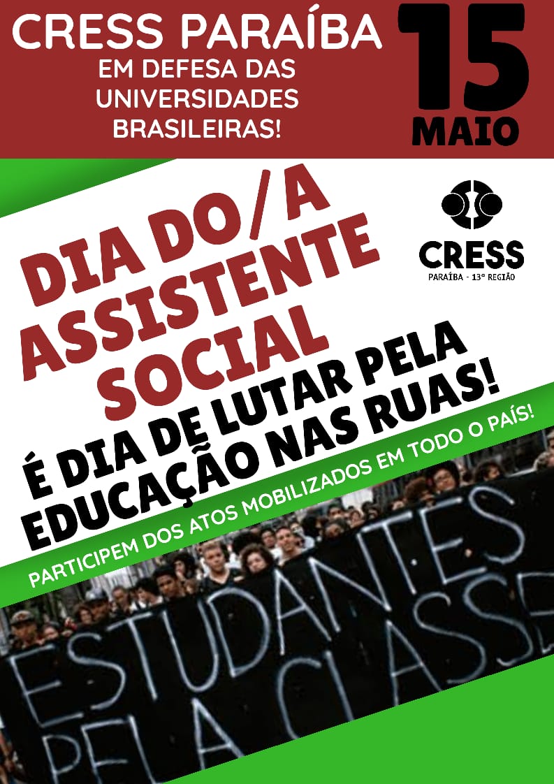 O Conselho Regional de Serviço Social da Paraíba vem convocar os/as Assistentes Sociais a participarem no dia 15 de maio das atividades em defesa da Educação pública, gratuita, laica, com qualidade e socialmente referenciada.