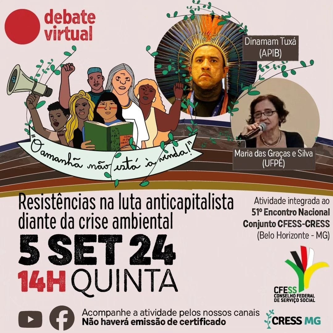 #DescriçãoDaImagem: card bege. No topo, o texto debate virtual. Abaixo, logo do evento, uma ilustração de pessoas diversas representando povos indígenas, quilombolas, ribeirinhos, originários. Ao lado, foto da liderança indígena Dinamam Tuxá e da professora Maria das Graças E Silva. Abaixo, o tema: o amanhã não está à venda. Resistências na luta anticapitalista diante da crise ambiental. Data e horário do debate: 5 de setembro, a partir das 14h. A atividade faz parte do 51º Encontro Nacional CFESS-CRESS, em BH-MG. No rodapé, texto “Não haverá emissão de certificado” e logos das entidades.