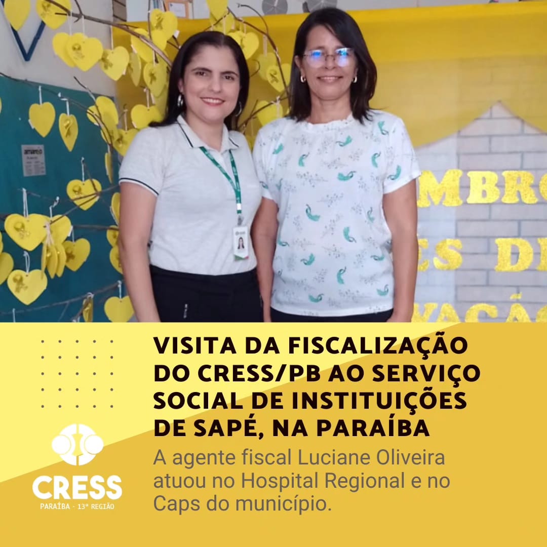 🚗 O CRESS/PB realizou, no último dia 27, visitas de fiscalização a instituições onde há profissionais do Serviço Social no município de Sapé, na Zona da Mata Paraibana.